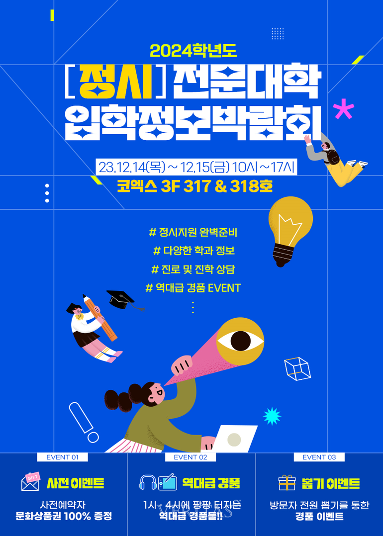[베리타스알파=권수진 기자] 전문대학 2024정시 개막을 앞두고 정시 박람회가 14~15일 양일간 코엑스에서 개최된다. 4년제 일반대 정시박람회(14~16일)와 기간이 겹치는 만큼 수험생들은 같은 날 일반대/전문대학 입시정보를 함께 얻을 수 있게 됐다. 해당기간 오전10시부터 오후5시까지 코엑스 3층 회의실에서 운영되며 사전예약 신청은 정시 전문대학 박람회 홈페이지에서 확인할 수 있다.