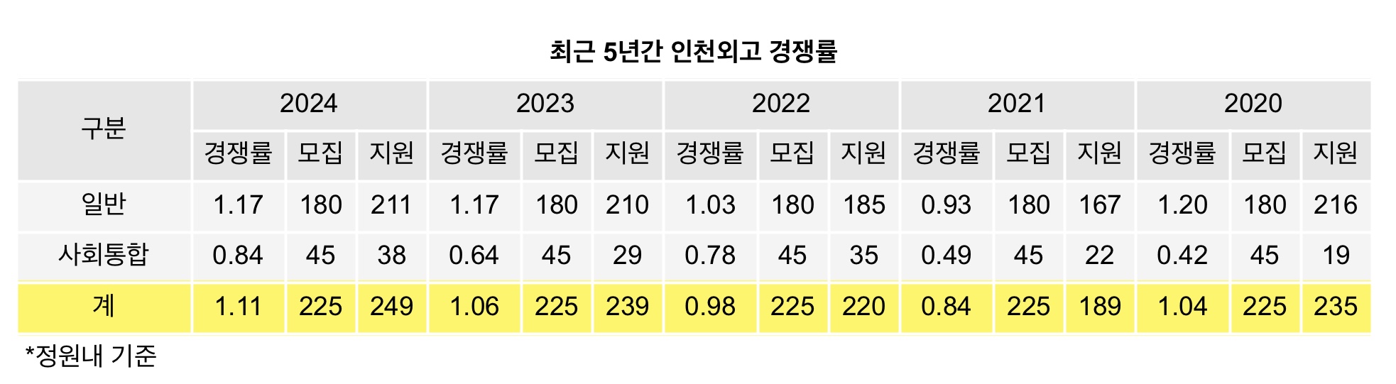 인천외고의 2024학년 최종경쟁률은 정원내 기준 1.11대1이다. 최근 5년간 추이를 살펴보면 2020학년 1.2대1(180명/200명), 2021학년 0.84대1(225명/189명), 2022학년 0.98대1(225명/220명), 2023학년 1.06대1(225명/239명), 2024학년 1.11대1(225명/249명)이다. 2021학년 이후 3년 연속 상승세를 보이고 있다.