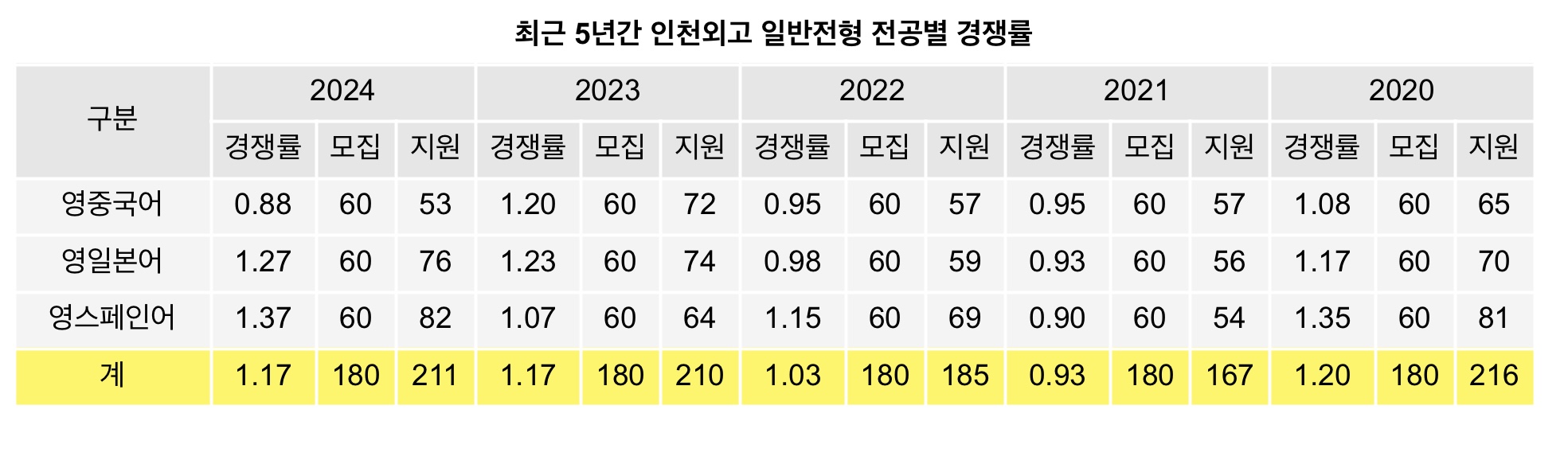일반전형 기준 전공별 최고 경쟁률은 영스페인어다. 60명 모집에 82명이 지원하면서 1.37대1의 경쟁률을 기록했다. 이어 영일본어 1.27대1(60명/76명), 영중국어 0.88대1(60명/53명)이다.