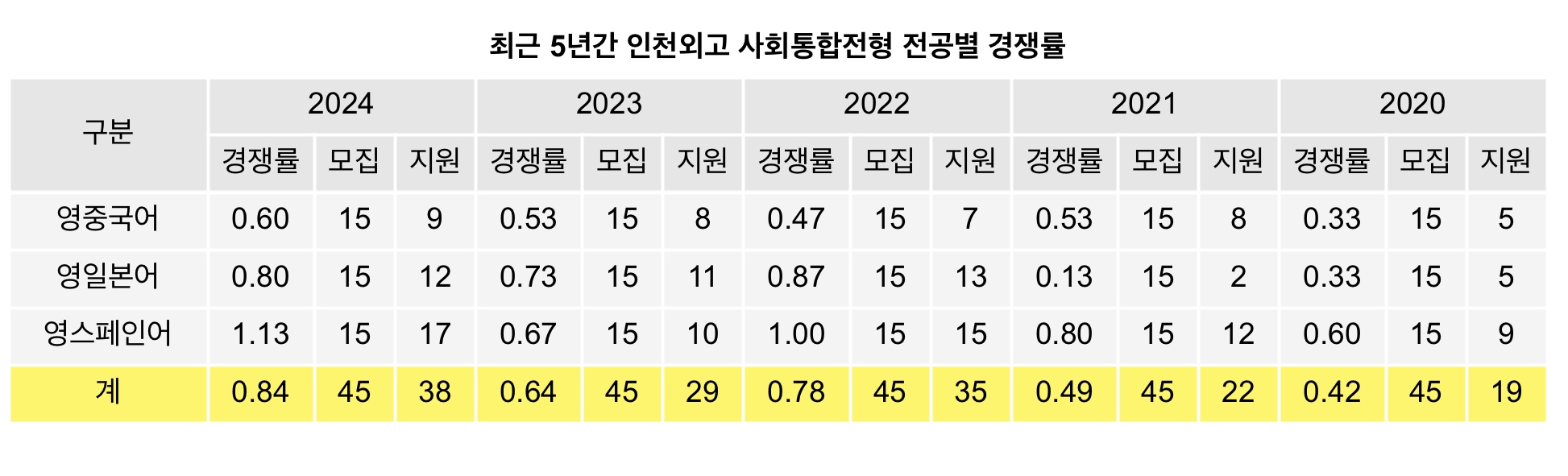 사회통합전형에서 역시 영스페인어가 1.13대1(15명/17명)로 가장 높은 경쟁률을 기록했다. 나머지 두개 전공은 모두 미달이다. 영일본어 0.8대1(15명/12명), 영중국어 0.6대1(15명/9명) 순이다.
