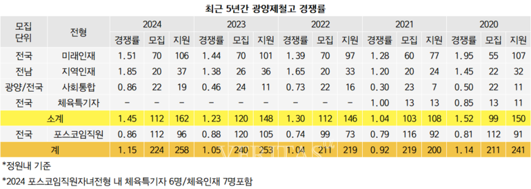 전형별로는 지역인재가 1.85대1(20명/37명)로 가장 높았다. 전국모집인 미래인재가 1.51대1(70명/106명)로 뒤를 이었다. 사회통합은 0.86대1(22명/19명), 포스코임직원은 0.86대1(112명/96명)로 지난해에 이어 올해도 미달이었다.