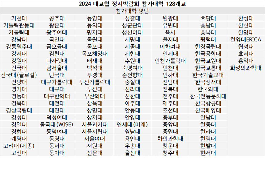 올해 참가대학은 128개 대학으로, 가천대 가톨릭관동대 가톨릭대 강남대 강릉원주대 강서대 강원대 건국대 건국대(글로컬) 건양대 경기대 경동대 경북대 경상국립대 경성대 경일대 경희대 계명대 고려대(세종) 고신대 공주대 광운대 광주여대 국민대 금오공대 김천대 나사렛대 남서울대 단국대 대구가톨릭대 대구대 대구한의대 대전대 대진대 덕성여대 동국대(WISE) 동덕여대 동명대 동서대 동아대 동양대 동의대 명지대 목원대 목포대 목포해양대 배재대 백석대 부경대 부산가톨릭대 부산대 부산외대 삼육대 상명대 상지대 서울과기대 서울시립대 서울여대 서원대 선문대 성결대 성균관대 성신여대 세명대 세종대 세한대 수원대 숙명여대 순천향대 숭실대 신라대 신한대 아주대 안동대 안양대 연세대(미래) 영남대 용인대 우송대 울산대 원광대 유원대 육사 을지대 이화여대 인제대 인천가톨릭대 인천대 인하대 전남대 전북대 전주대 제주대 조선대 중부대 중앙대 중원대 차의과학대 청운대 청주대 초당대 충남대 충북대 평택대 한경국립대 한국공학대 한국교원대 한국교통대 한국기술교대 한국성서대 한국외대 한국전통문화대 한국항공대 한국해양대 한남대 한동대 한라대 한림대 한밭대 한서대 한성대 한신대 한양대 한양대ERICA 협성대 호서대 홍익대 화성의과학대다.