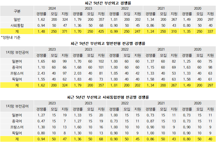 부산외고의 2024 경쟁률은 1.48대1(250명/371명)이다. 최근 5년간의 추이를 살펴보면 2020학년 1.35대1(250명/337명), 2021학년 1.24명(250명/310명), 2022학년 0.99대1(250명/247명) 순으로 하락하다가, 2023학년 1.7대1(250명/425명)로 상승, 올해는 다시 하락한 모습이다.