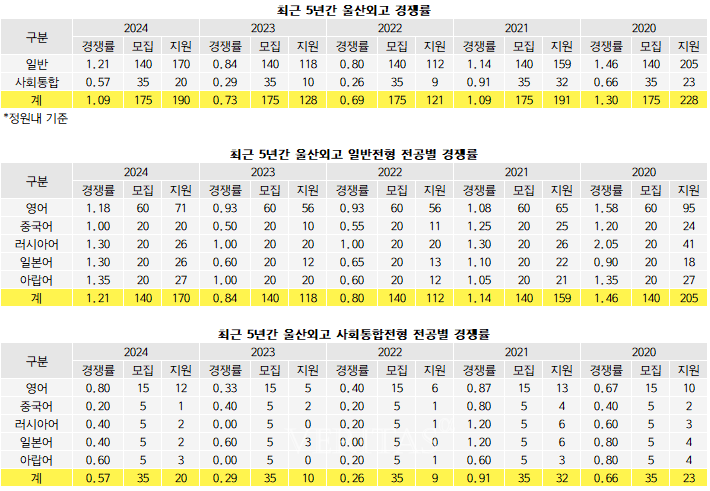 울산외고는 올해 175명 모집에 190명이 지원하면서 경쟁률 1.09대1로 마감했다. 2022학년 0.69대1(175명/121명), 2023학년 0.73대1(175명/128명)까지 2년째 이어지던 미달을 올해 해소했다.