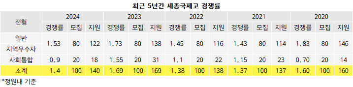 올해 세종국제고의 신입생 경쟁률은 정원내 기준 1.4대1(100명/140명)이다. 최근 5년간 경쟁률을 살펴보면 일정 수준 이내에서 등락을 반복하고 있다. 2020학년 1.6대1(100명/160명), 2021학년 1.37대1(100명/137명)로 하락하다 2022학년 1.38대1(100명/138명), 2023학년 1.69대1(100명/169명)로 상승, 올해는 다시 하락했다.
