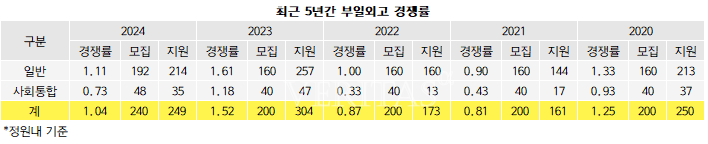 올해 240명을 모집한 결과 249명이 지원하면서 2024학년 최종경쟁률은 1.04대1로 마감했다. 전년 1.52대1(200명/304명)보다 하락했다.