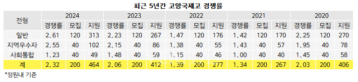 고양국제고의 2024학년 정원내 경쟁률은 2.32대1(200명/464명)이다. 최근 5년간 경쟁률은 2020학년 2.03대1(200명/406명), 2021학년 1.34대1(200명/267명), 2022학년 1.39대1(200명/277명), 2023학년 2.06대1(200명/412명), 2024학년 2.32대1(200명/464명)로 3년연속 상승세를 보이고 있다.