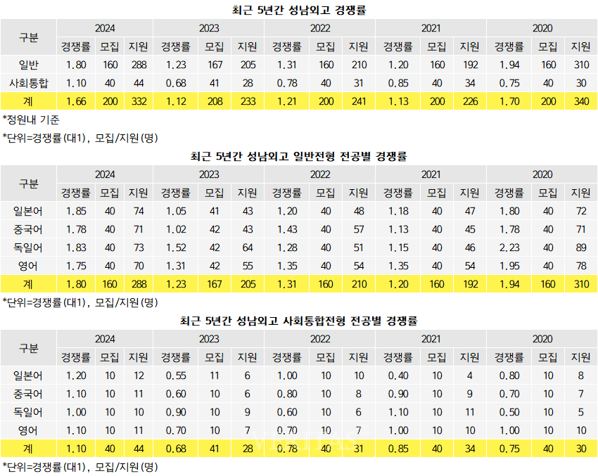올해 일반전형 경쟁률은 1.8대1(160명/288명)로 지난해 1.23대1(167명/205명)보다 상승했다. 전공별로는 일본어가 1.85대1(40명/74명)로 가장 높았다. 독일어 1.83대1(40명/73명), 중국어 1.78대1(40명/71명), 영어 1.75대1(40명/70명) 순이다.