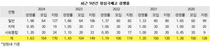 올해 청심국제고의 최종경쟁률은 1.63대1(104명/170명)이다. 최근 5년간 경쟁률의 추이를 살펴보면 2020학년 1.28대1(100명/128명), 2021학년 1.2대1(100명/120명), 2022학년 1.19대1(100명/119명), 2023학년 1.43대1(104명/149명), 2024학년 1.63대1의 추이다. 최근 3년 연속 상승세다.