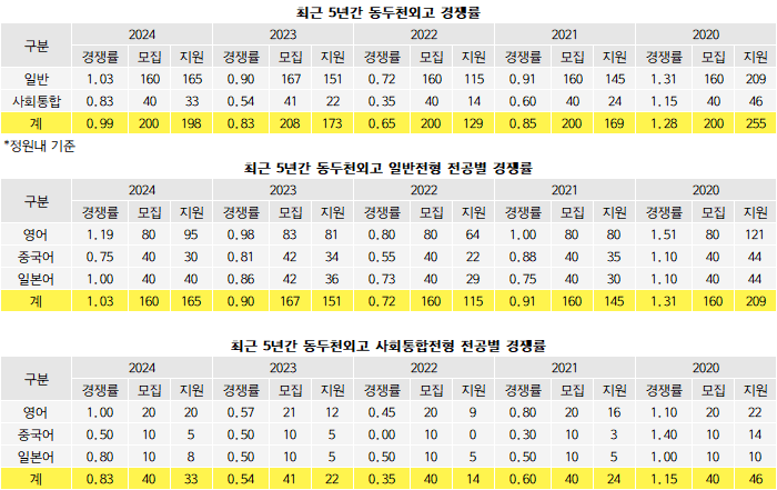 올해 동두천외고의 최종경쟁률은 0.99대1(200명/198명)이다. 최근 5년간의 경쟁률 추이를 살펴보면 2020학년 1.28대1(200명/255명), 2021학년 0.85대1(200명/169명), 2022학년 0.65대1(200명/129명) 순으로 감소하다가, 2023학년 0.83대1(208명/173명), 2024학년 0.99대1 순으로 2년 연속 상승했다.