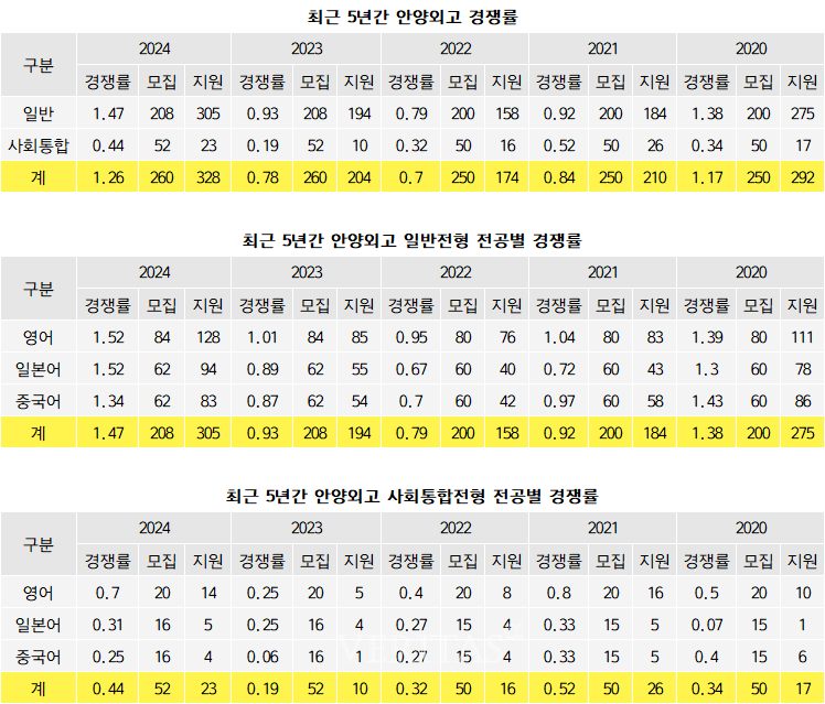 일반전형의 경쟁률은 1.47대1(208명/305명)로 지난해 0.93대1(208명/194명)에서 큰 폭으로 상승했다. 지난해와 비교해 지원자가 111명 더 늘었다. 전공별로는 영어와 일본어가 각 1.52대1(84명/128명), 1.52대1(62명/94명)로 동일했고, 중국어가 1.34대1(62명/83명)이었다.