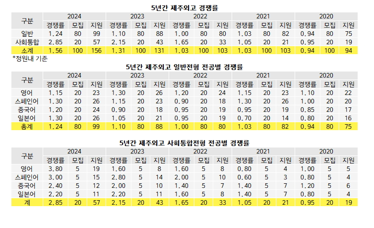 전형별 경쟁률은 일반 1.24대1(80명/99명), 사회통합 2.85대1(20명/57명)이다. 일반전형에서 스페인어와 일본어가 각각 20명 모집에 26명이 지원해 1.3대1로 가장 높다. 이어 중국어 1.2대1(20명/24명), 영어 1.15대1(20명/23명) 순이다.