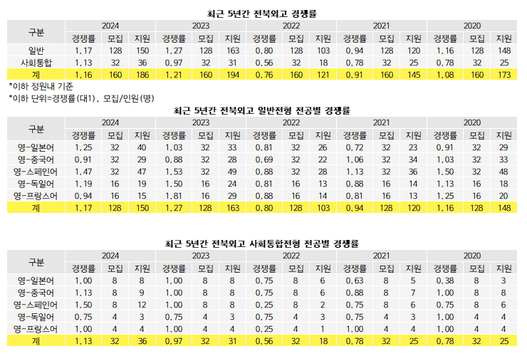 전북외고의 2024경쟁률은 정원내 기준 160명 모집에 186명이 지원해 1.16대1로 마감했다. 지난해 1.21대1(모집160명/지원194명)보다 지원자가 8명 감소했다. 전북외고 경쟁률은 2019학년 1.34대1(160명/215명), 2020학년 1.08대1(160명/173명), 2021학년 0.91대1(160명/145명), 2022학년 0.76대1(160명/121명), 2023학년 1.21대1(160명/194명)의 추이다.