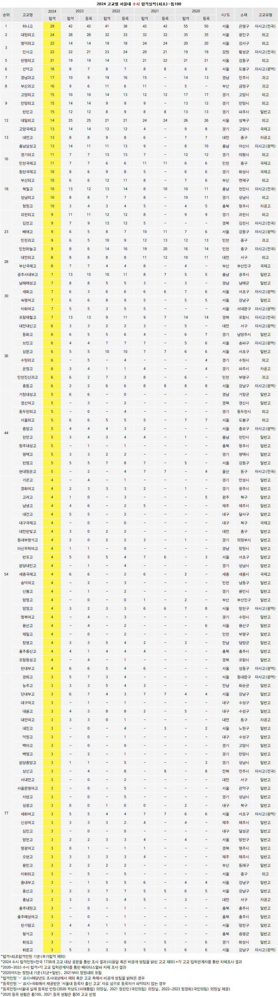 톱100 이후 고교의 실적은 다음과 같다. 민감한 정보를 공개해 준 고교와 많은 도움을 주신 현장 전문가들께 감사를 표한다. 동일 실적 내 고교들은 이름 순으로 배치했다. 추가 조사되는 현황은 추후 수시 실적을 포함한 정시 톱100 기사로 소개할 예정이다.
