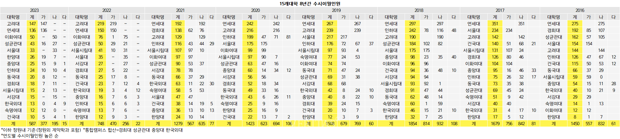 상위15개대 중 이월인원 규모 자체가 가장 많았던 곳은 고대다. 147명은 최종 모집인원 1643명의 8.9%를 차지했다. 2016학년 144명, 2017학년 142명, 2018학년 190명, 2019학년 239명, 2020학년 216명, 2021학년 129명, 2022학년 219명, 2023학년 147명의 추이다.