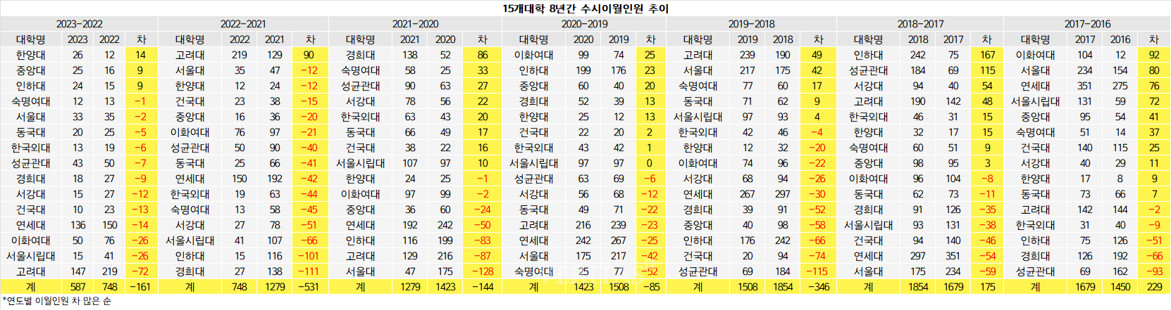 연대 14명 감소(150명→136명), 건대 13명 감소(23명→10명), 서강대 12명 감소(27명→15명), 경희대 9명 감소(27명→18명), 성대 7명 감소(50명→43명), 외대 6명 감소(19명→13명), 동대 5명 감소(25명→20명), 서울대 2명 감소(35명→33명), 숙대 1명 감소(13명→12명) 순이다.
