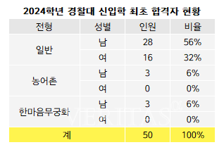 2024경찰대학 최초합격자는 남성이 34명, 여성이 16명인 것으로 나타났다. 전형별로는 일반에서 남성 28명, 여성 16명이었으며 농어촌과 한마음무궁화는 남성만 각 3명 합격했다. 1차시험 합격자 발표까지만 해도 여성은 많지 않았다. 8월4일 경찰대가 발표한 ‘2024학년 경찰대학 신입생 입학전형 1차 시험 합격자 공고’에 따르면 1차시험 합격자 수는 309명이었다. 이 중 여성은 83명(26.8%)으로 적었다. 때문에 최종합격자 역시 많지 않을 것이라는 분석이 주를 이뤘지만 예상과 달리 여성 최종합격자는 32%인 16명이나 됐다. 2020학년까지 규정된 12명, 이후 2021학년과 2022학년 각 11명, 2023학년 8명과 비교해 역대 최다치를 기록한 것이다.