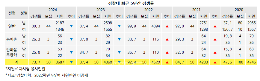 2024학년 경찰대의 경쟁률은 73.7대1이었다. 50명 모집에 3687명이 지원한 결과다. 전형별 지원인원은 일반전형 3533명(남 2187명/여 1346명), 농어촌 79명(56명/23명), 한마음무궁화 75명(53명/22명)이다. 모집인원 대비 경쟁률로 살펴보면 일반 80.3대1, 농어촌 26.3대1, 한마음무궁화 25대1이다.