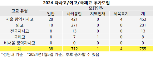 1월5일 기준 추가모집 규모를 확정지은 서울 광역자사고는 7개교다. 사회통합으로 421명을 모집하고, 일반 28명, 체육특기자 4명을 모집한다.