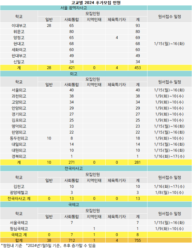 <서울 광역자사고 추가모집.. 원서접수 15일~16일>