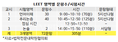 시험은 7월21일 실시한다. 수험생은 배정된 시험장에 오전8시30분까지 입실해야 한다. 시험 영역은 언어이해 30문항 70분, 추리논증 40문항 125분, 논술 2문항 110분으로 총 72문항을 305분간 푼다. 1교시 언어이해는 오전9시부터 10시10분까지, 2교시 추리논증은 10시45분부터 낮12시50분까지, 3교시 논술은 오후2시부터 3시50분까지다. 매 교시 시작 10분 전까지 입실을 완료해야 하고, 중간에 퇴실은 불가하다.