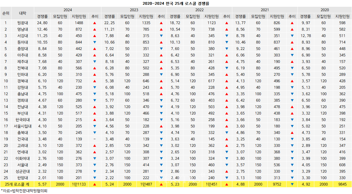 <2024 전국 25개 로스쿨 경쟁률 5.57대1 ‘상승’.. 원광대 24.8대1 ‘4년 연속 역대 최고’>