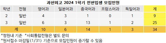 [베리타스알파=조혜연 기자] 과천외고가 2024학년 1학기 전편입생을 모집한다고 최근 발표했다. 정원내 기준 일반전형으로 2학년 9명, 3학년 25명을 모집한다. 전공별로는 2학년 영어 4명, 일본어 3명, 중국어 독일어 각 1명씩을 모집한다. 3학년은 영어 6명, 일본어 3명, 중국어 13명, 프랑스어 1명, 독일어 2명을 모집한다.