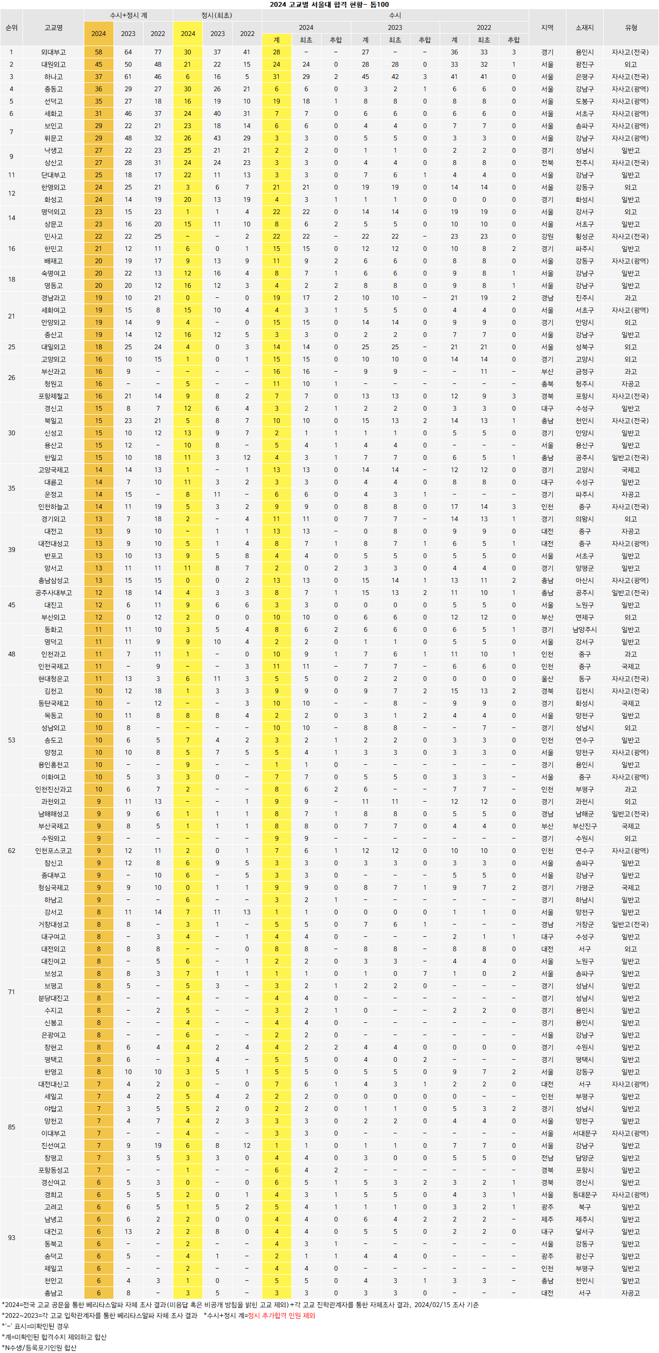 1일 발표된 2024 서울대 정시 합격자는 현 상황에서 고교별 합격인원이 더 늘어날 수도 있다. 재수생을 포함한 N수생의 합격 가능성 때문이다. 일부 재수생까지 파악한 학교도 있지만 아예 재학생만 파악된 학교도 있다. 추가제보가 들어오는 대로 기사를 계속해서 보완할 예정이다.