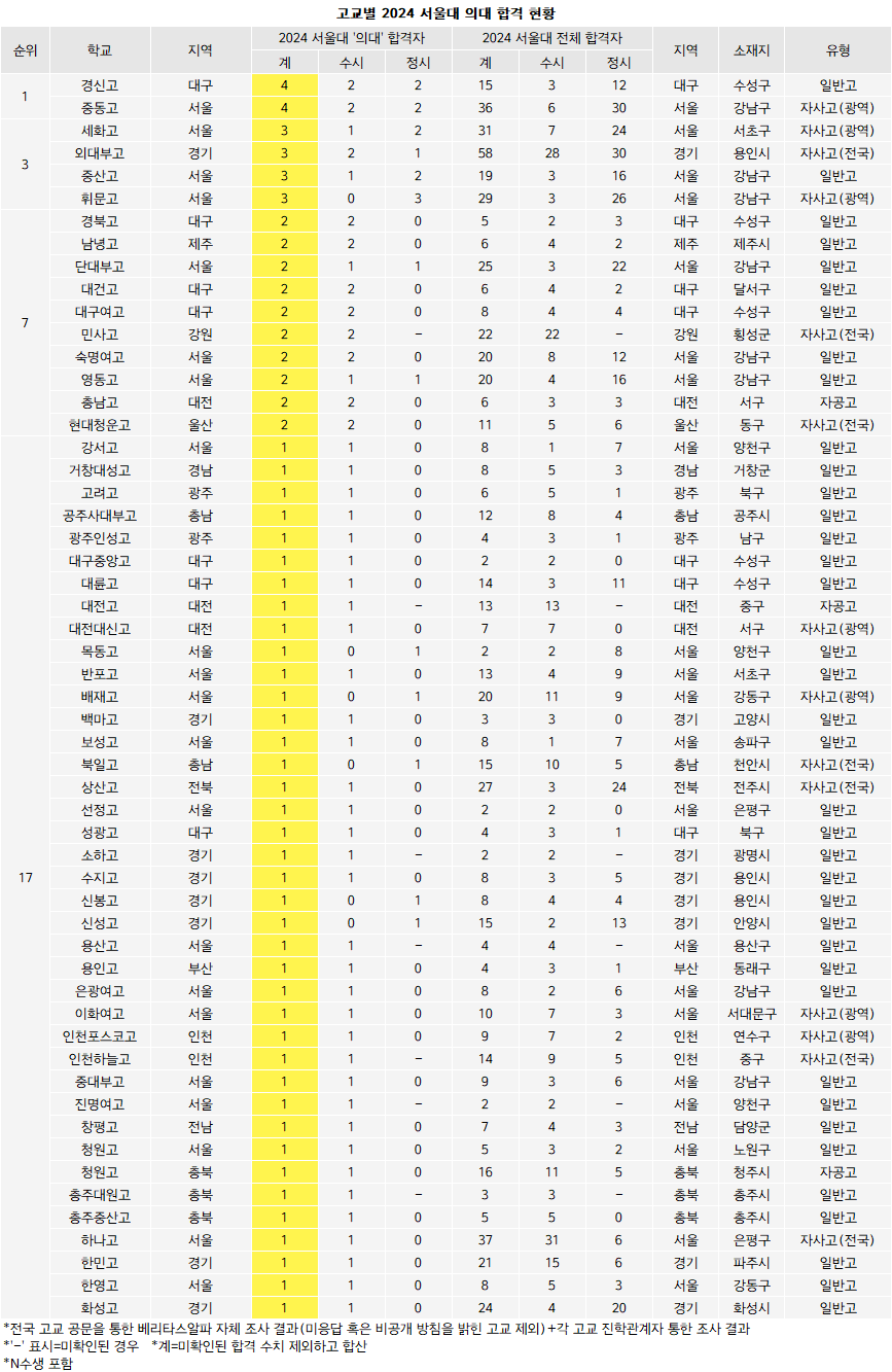 1일 발표된 2024 서울대 정시 합격자는 현 상황에서 고교별 합격인원이 더 늘어날 수도 있다. 재수생을 포함한 N수생의 합격 가능성 때문이다. 일부 재수생까지 파악한 학교도 있지만 아예 재학생만 파악된 학교도 있다. 추가제보가 들어오는 대로 기사를 계속해서 보완할 예정이다.