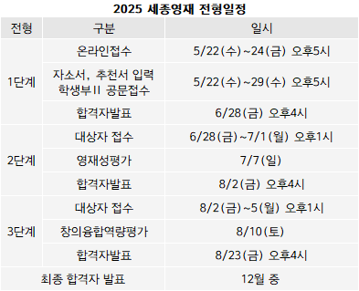[베리타스알파=조혜연 기자] 세종영재가 2025모집요강을 공개했다. 전국 8개 영재학교 가운데 인천영재 대전과고 서울과고에 이어 네 번째다. 올해 세종영재는 지역인재 우선선발 전형방법을 일부 변경했다. 지난해에는 2단계 성적이 정원내 모집인원의 1.5배수에 들지 못하면 지역인재 우선선발 대상에서 제외했지만, 올해는 1단계와 2단계를 종합평가한 결과가 1.5배수에 들면 대상자로 선정한다. 지난해에 비해 1단계 서류평가의 영향력이 확대된 것이다.