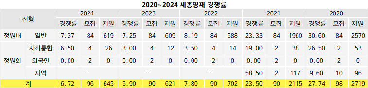 지난해 세종영재의 경쟁률은 정원내 기준 7.37대1로 나타났다. 모집인원 84명에 619명이 지원한 결과다. 전년 정원내 7.25대1(모집 84명/지원 609명)보다 지원자가 10명 늘면서 경쟁률도 소폭 올랐다. 정원외 사회통합은 6.5대1(4명/26명)이다. 전년 3대1(4명/12명)보다 크게 올랐다.