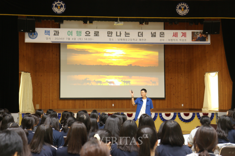 [베리타스알파=조혜연 기자] 남해해성고가 재학생을 대상으로 여행 프리랜서 박성호 작가의 특강을 4일 실시했다고 밝혔다. ‘책과 여행으로 만나는 더 넓은 세계’를 주제로 초중학교 시절의 대치동 키즈로서의 삶, 기숙사 고등학교 시절 학업의 좌절과 극복 과정, KAIST에서의 다양한 연구와 경험 속에서 자신의 인생 항로를 개척한 스토리를 펼쳤다.