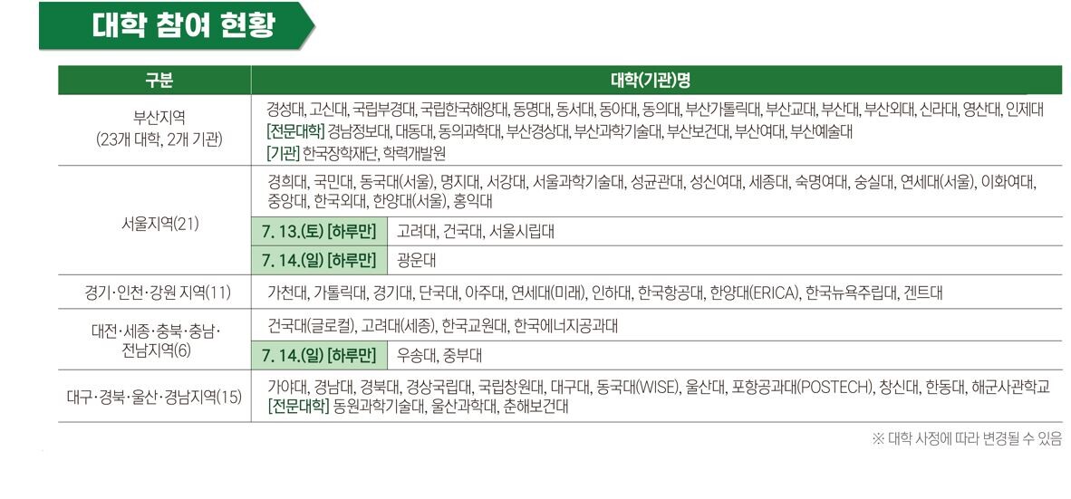 부산교육청이 주관하는 이번 캠프는 △대학정보관 △대면상담관 △주제별 설명회관으로 구성된다. △‘대학정보관’에서는 부산지역 대학 23개교, 서울지역 대학 21개교 등 총 76개 대학이 참여해 대입 정보를 전하는 부스를 운영한다. 타 박람회와 비슷하게 대학별 상담 역시 제공할 예정이다. △‘대면상담관’에서는 부산진학지원단 상담위원들이 부산 관내 고3과 학교 밖 청소년, 학부모를 대상으로 12회(회당 40명)에 걸쳐 2025학년 수시전형 관련 1대1 대면 상담을 진행한다. 참여자는 학생부, 모평, 학평 성적표, 대입정보포털 어디가 ID 등을 지참하면 보다 구체적인 상담을 받을 수 있다. △‘주제별 설명회관’에서는 의약계열, 2025대입 수시모집 요강 분석, 2026학년 대학입학전형시행계획 설명회와 학종 토크 콘서트 등 주제에 따른 설명회를 실시한다. 진학전문가, 대입지원관, 진학지원단 전문위원이 강사로 나서 최근 대입 관련 정보를 제공할 예정이다. 특히 올해는 의대 증원 이슈와 관련해 의약계열 설명회를 2회 실시할 예정이다.