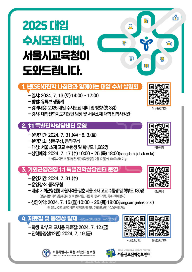 뿐만 아니라 '1:1특별진학상담센터'도 운영해 수험생과 학부모의 입시준비를 돕는다. 31일부터 8월3일까지 성북구청, 동작구청에서 진행하는 상담은 서울 소재 고교 수험생과 학부모 1662명이 대상이다. 상담일정을 구체적으로 살펴보면 △31일 오후2시부터 5시30분까지 성북구청 △8월1일~3일 오전10시부터 5시10분까지 성북구청, 동작구청에서 연다. 서울교육청 대학진학지도지원단 소속 교사 등이 1인당 40분 내외 인문 자연 의학 특성화고 미술 음악 연극 영화영상 체육 등 다양한 계열의 맞춤형 상담을 제공할 예정이다. 상담 예약은 17일 오전10시부터 25일 오후6시까지 선착순 접수한다. 서울진로진학정보센터 홈페이지 팝업에 안내한 URL을 통해 신청하면 된다.