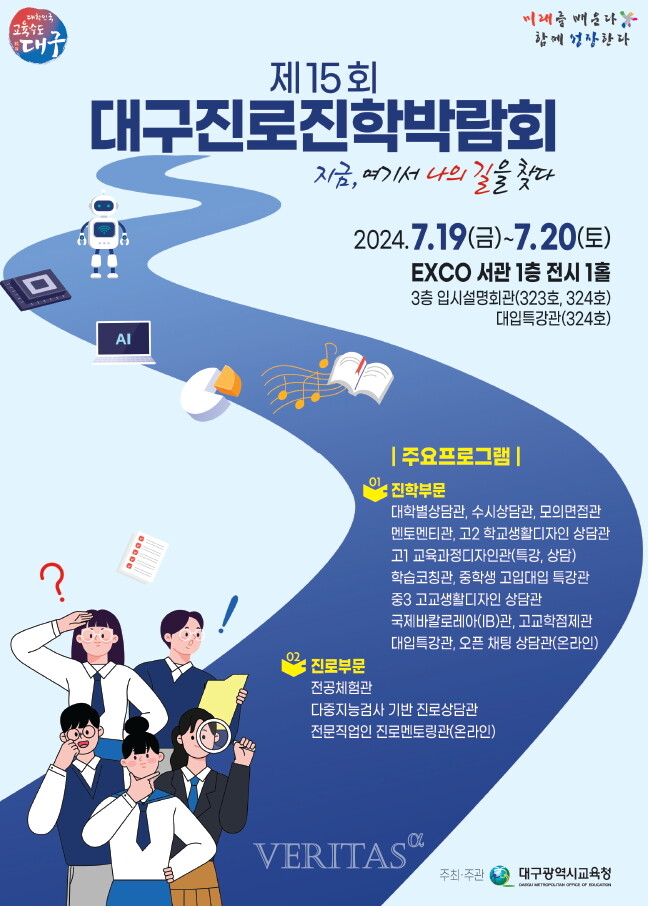 [베리타스알파=김하연 기자] 대구교육청은 19일, 20일 대구 EXCO에서 ‘제15회 대구 진로진학박람회’를 진행한다. ‘지금, 여기서 나의 길을 찾다!’라는 주제로 한 박람회는 중학생부터 졸업생까지 다양한 연령대 참가자의 눈높이에 맞춰 1:1 상담부터 소규모 강의, 대규모 특강까지 한층 다채롭게 구성된 16개관(진학부문 13개관, 진로부문 3개관)이 마련되어 입시정책의 변화에 따라 달라지는 교육수요자의 기호에 맞춰 대구시교육청만의 특색 있는 프로그램으로 운영된다.