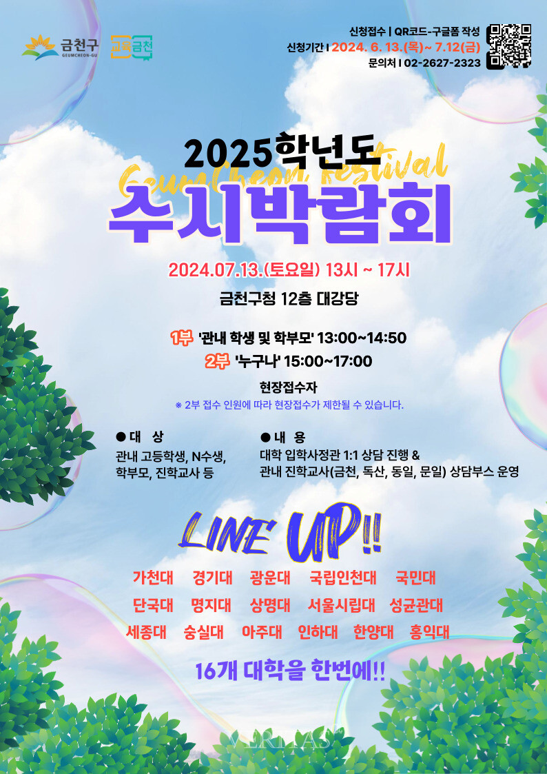 [베리타스알파=김하연 기자] 서울 금천구는 13일 오후1시 금천구청 대강당에서 2025학년 대입 대비 수시박람회를 진행한다. 박람회는 수시모집을 준비하는 학생과 학부모에게 주요 대학 입학사정관과의 1대1 상담을 지원하기 위해 마련됐다.