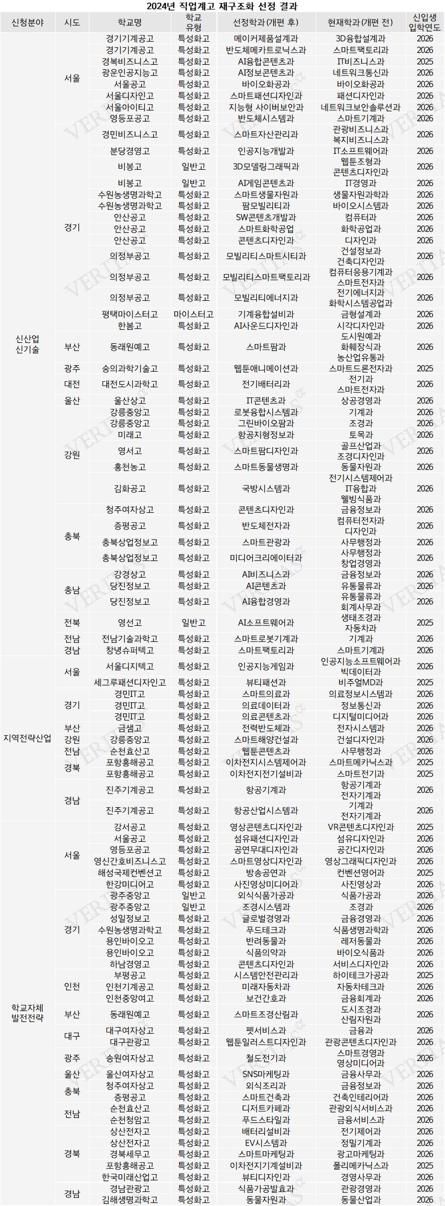[베리타스알파=권수진 기자] 산업구조 변화에 대응한 직업계고 학과 개편을 지원하는 ‘직업계고 재구조화 지원 사업’에 평택마이스터고 등 60개교 86개 학과가 선정됐다. 반도체/인공지능(AI)/소프트웨어(SW) 등 신산업/신기술 분야로 개편된 학과가 42개로 가장 많고, 지역전략산업 분야 12개, 학교자체발전 분야 32개다. 전공과 융합해 신산업/신기술 분야 역량을 함양하는 모듈형 과정인 소단위(마이크로) 교육과정에도 10개 과정이 선정됐다.