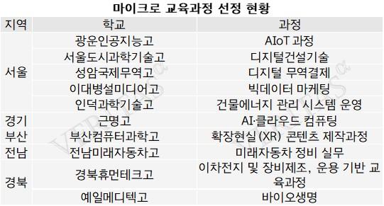 선정 고교를 유형별로 살펴보면 마이스터고 가운데서는 평택마이스터고가 유일하게 선정됐다. 특성화학과를 운영하는 일반고 중에서는 광주중앙고 비봉고 영선고의 3개교가 선정됐고 나머지 56개교는 모두 특성화고다.