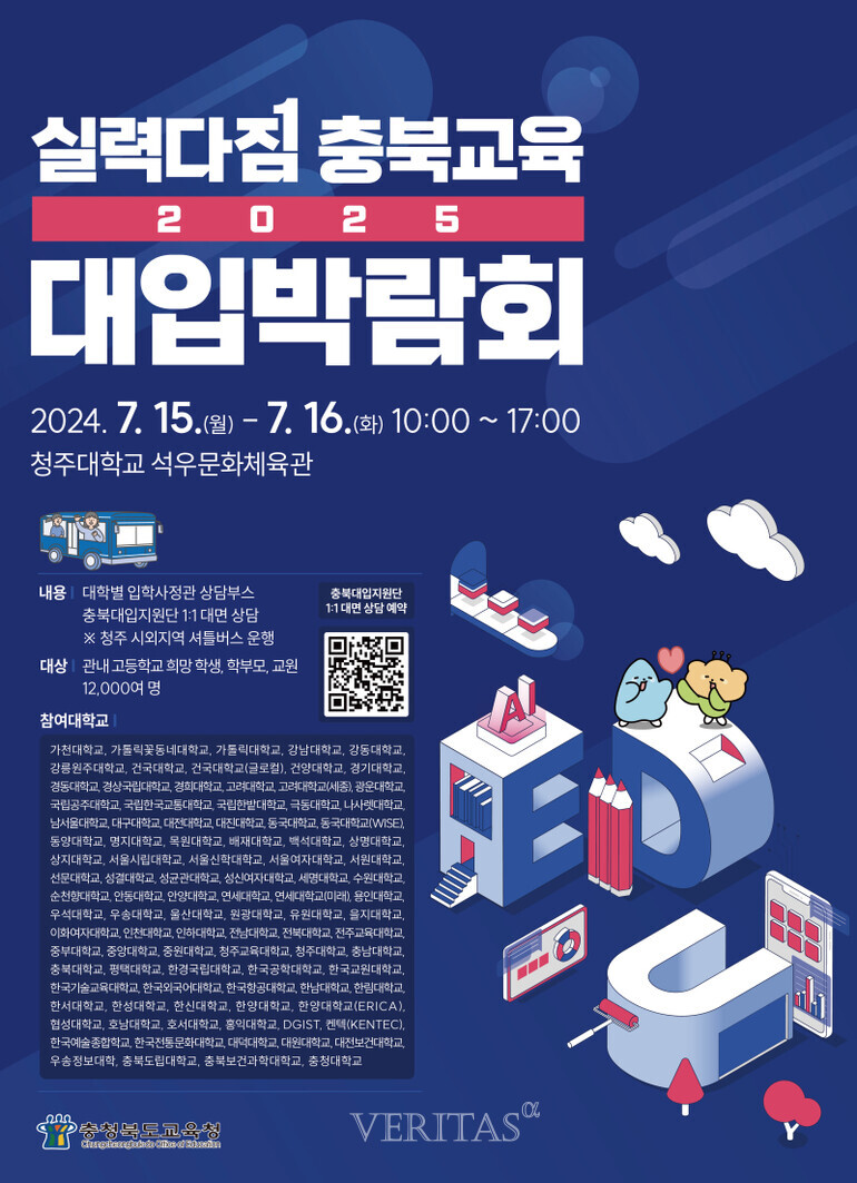 [베리타스알파=김하연 기자] 충북교육청이 15일, 16일 이틀간 청주대 석우문화체육관에서 '실력다짐 충북교육 2025 대입박람회'를 연다. 박람회는 △대학별 입학사정관 상담 △충북대입지원단 1대1 대면 상담 부스 △참여 이벤트 등으로 구성된다.