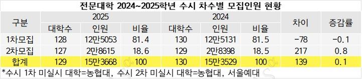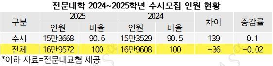 [베리타스알파=권수진 기자] 올해 수시에서 전국 129개 전문대학은 전체 모집인원의 90.6%인 15만3668명을 모집한다. 지난해 90.5%와 비교해 비중은 큰 차이가 없다. 수시/정시를 합산한 전체 모집인원은 16만9572명으로 지난해 16만9608명보다 36명 감소해 비슷한 수준이다. 수시의 경우 지난해 15만3529명보다 139명 증가했다.
