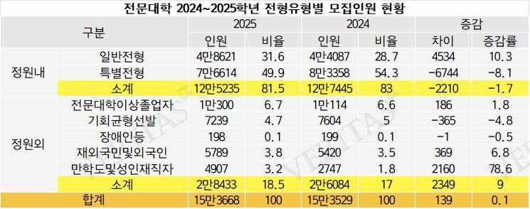 정원내 모집인원이 감소한 반면 정원외 인원이 증가했다. 정원내 12만5235명(81.5%)으로, 지난해 12만7445명보다 2210명(1.7%) 감소했다. 정원외는 2만8433명(18.5%)으로 지난해 2만6084명보다 2349명(9%) 증가했다. 이는 지역의 늘어나는 성인학습자의 수요를 반영해, 정원외 특별전형인 비수도권 만학도/성인재직자 모집인원을 확대한 영향이다.