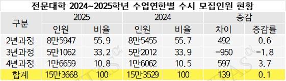 모집 규모는 2년 과정이 가장 크고, 4년 과정이 가장 작다. 올해 2년 과정은 8만5947명(55.9%), 3년 과정은 5만1062명(33.2%), 4년 과정은 1만6659명(10.8%)을 모집한다.
