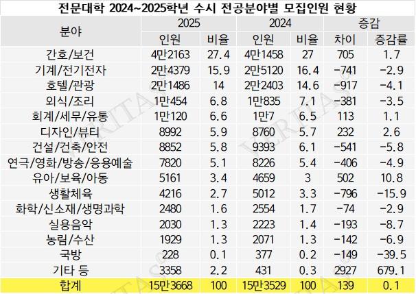 모집규모가 가장 큰 전공은 올해도 간호/보건 분야다. 지난해 4만1458명보다 규모를 더 확대해 4만2163명을 모집한다. 전체 모집인원에서 차지하는 비중도 27.4%로 지난해 27%보다 소폭 확대됐다.
