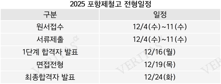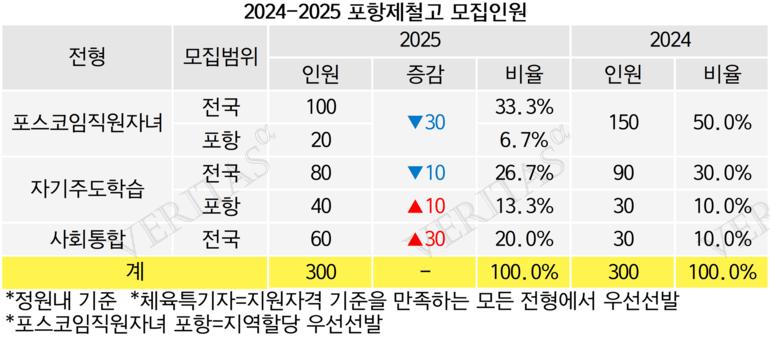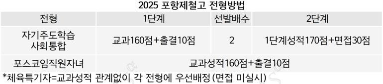 포항제철고는 2025 신입생으로 정원내 300명을 모집한다. 지난해와 동일하다. 선발전형은 크게 포스코임직원자녀전형 자기주도학습전형 사회통합전형 세 개로 나뉜다. 포스코임직원자녀와 자기주도학습전형이 각 120명(40%)을 모집하고, 사회통합이 60명(20%)을 모집한다.