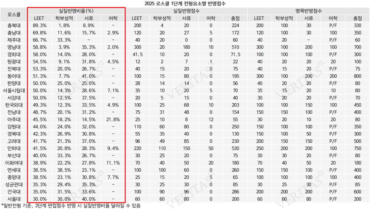 <2025로스쿨 1단계 전형요소별 반영비율.. LEET 충북대 ‘최고’>