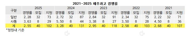 [베리타스알파=김하연 기자] 29일 접수를 마감한 제주과고에 따르면 2025신입생 원서접수 결과 최종경쟁률은 2.55대1로 나타났다. 정원내 40명 모집에 102명이 지원한 결과다. 지난해3.28대1(모집40명/지원131명)보다 경쟁률이 하락했다.