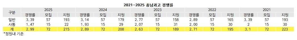 [베리타스알파=김하연 기자] 2일 원서접수를 마감한 충남과고 2025신입생 모집 원서접수 결과에 따르면 최종경쟁률은 2.99대1이다. 72명 모집에 215명이 지원한 결과다. 지난해 2.89대1(72명/208명)에서 상승했지만 지원자가 8명 늘어 비슷한 수준이다. 전형별로 살펴보면 일반은 57명 모집에 193명이 지원해 3.39대1을 기록했다. 지난해 3.14대1(57명/179명)보다 상승했다. 사회통합 경쟁률은 1.49대1로, 15명 모집에 22명이 지원해 지난해 1.93대1(15명/29명)보다 하락했다. 충남과고는 원서접수 2일 원서접수를 마감하고 다음날인 3일 오전 경쟁률을 발표했다.