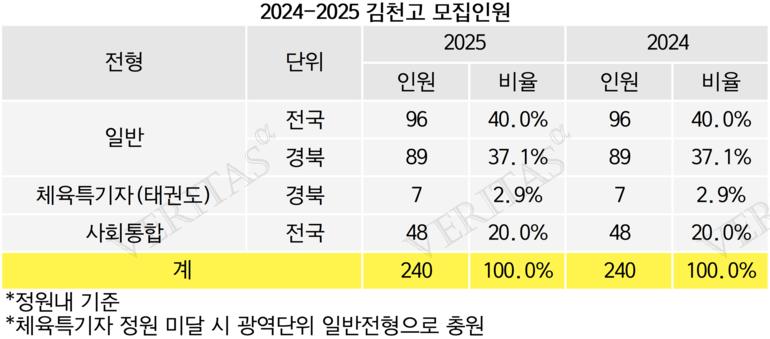 [베리타스알파=조혜연 기자] 올해 김천고는 정원내 기준으로 240명을 모집한다. 전형별로 일반 185명, 체육특기자(태권도) 7명, 사회통합 48명으로 지난해와 동일하다. 일반전형은 전국단위와 경북 광역단위로 선발인원을 구분한다. 일반전형에서 전국단위로 선발하는 인원은 96명, 경북에서만 선발하는 인원은 89명이다. 두 모집단위의 정원이 미달될 시 교차로 충원할 수 있다. 체육특기자는 경북 광역단위로만 7명을 선발한다. 정원 미달 시 광역단위 일반전형으로 충원한다. 사회통합전형은 지역에 상관없이 전국에서 선발한다.