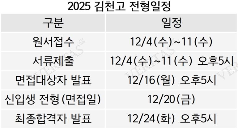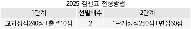 전형방법도 지난해와 동일하다. 1단계에서 교과와 출결점수를 합해 모집인원의 1.5배수~2배수를 선발하고, 2단계에서 1단계성적과 면접점수를 합해 최종합격자를 선발하는 방식이다. 교과성적은 김천고가 홈페에지에 공개해 둔 ‘2025학년 신입생 내신성적 산출표’ 프로그램을 통해 쉽게 계산해 볼 수 있다. 학기별, 과목별 성취도 성적을 입력하면 자동으로 환산점수가 계산되는 자료로 학교 측의 수요자 친화적인 면모가 돋보이는 프로그램이다.