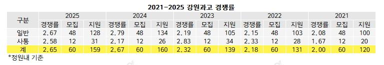 [베리타스알파=김하연 기자] 3일 원서접수를 마감한 강원과고에 따르면 2025신입생모집 최종경쟁률은 2.65대1로 나타났다. 정원내 60명 모집에 159명이 지원한 결과다. 지난해 2.67대1(모집60명/지원160명)보다 하락했지만 모집인원이 전년대비 1명 줄어 비슷한 수준이다. 전형별로 살펴보면 일반은 지난해 2.79대1(48명/134명)에서 올해 2.67대1(48명/128명)으로 하락했다. 사회통합은 지난해 2.17대1(12명/26명)에서 올해 2.58대1(12명/31명)로 상승했다. 강원과고는 3일 원서접수를 마감하고 하루 뒤인 4일 경쟁률을 발표했다.